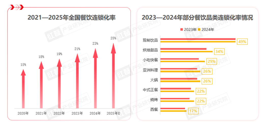 市场消费低迷,竞争却更激烈。截至今年8月,餐饮相关企业存量达1603万家,连锁化趋势增强,各赛道连锁化率均有提升,预计2025年餐饮连锁化率将提至25%左右。