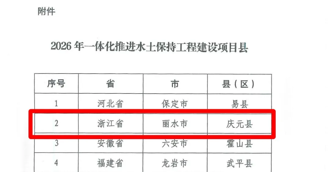 近日,水利部办公厅正式公布2026年一体化推进水土保持工程建设项目竞争性遴选结果,全国仅有10个县入围,庆元县成功入选,并获得中央水保资金8000万元。