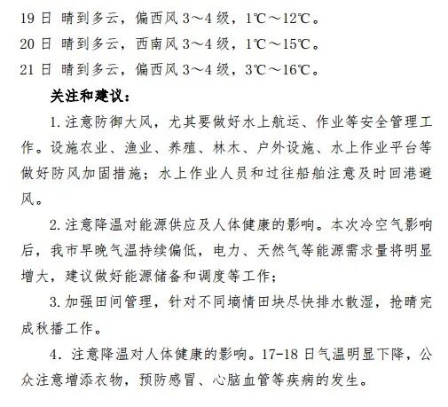 气温情况:16 - 18日48小时最低气温降幅8℃左右,18日至20日早晨最低气温降至1℃左右,有霜或霜冻。