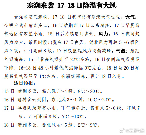 风力情况:16日夜间起风力增大,17日白天偏北风力可达5 - 6级阵风7级,江河湖面8级,17日夜里起风力逐渐减弱。