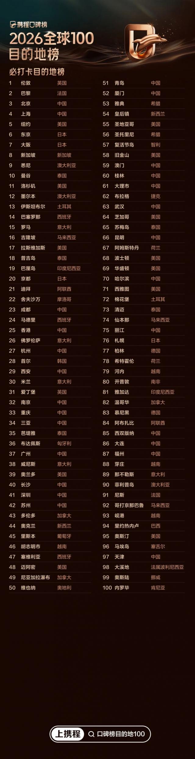 本次榜单依据亿级用户的真实出行数据和口碑评价评选得出,覆盖全球108个国家、93个榜单主题,构建了全球100、亚洲100、中国100、欧洲100、美洲100等系列榜单,全面涵盖酒店、景点、夜游、美食、目的地五大核心维度。其评选结果既有数据支撑,又得到市场广泛认可,为全球旅行者提供了极具参考价值的“下一站”出行指南。