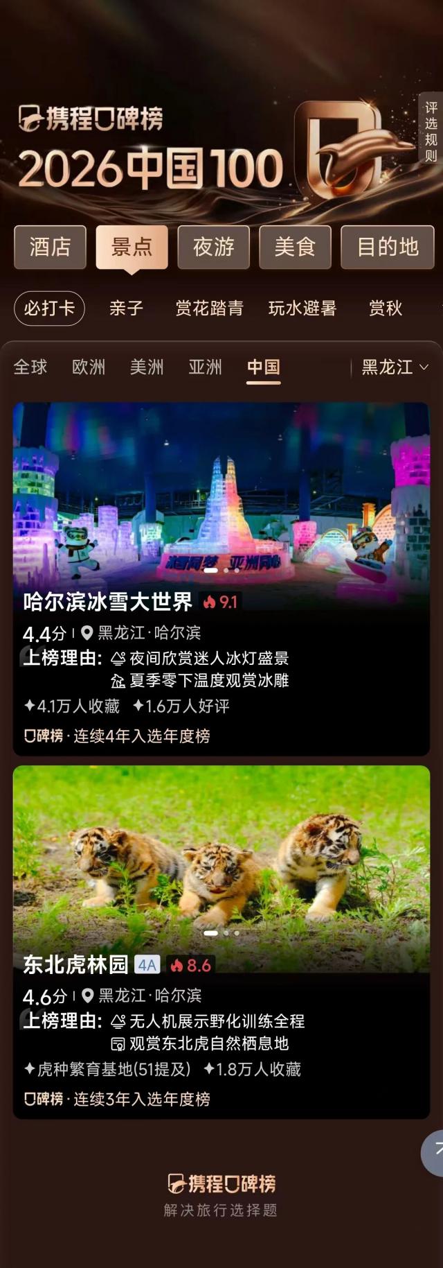 近日,携程口碑榜2026年度榜单正式揭晓。在亿级数据的有力支撑下,哈尔滨凭借丰富的文旅资源和独特魅力,登上该榜多个子榜单,在2026“全球100目的地”榜中位居第70位。与此同时,哈尔滨的多个景区、酒店也凭借特色与优质服务一同上榜。