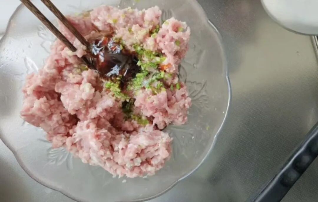 1. 在猪肉末中加入生姜末、小葱、生抽、蚝油、芝麻油、盐等调味料,然后用筷子朝一个方向用力搅拌,直到肉馅变得粘稠上劲。