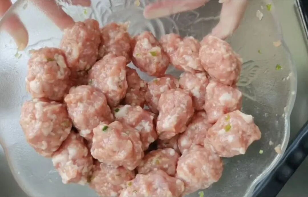 2. 将搅拌好的肉馅捏成乒乓球大小的小团,放在一旁备用。