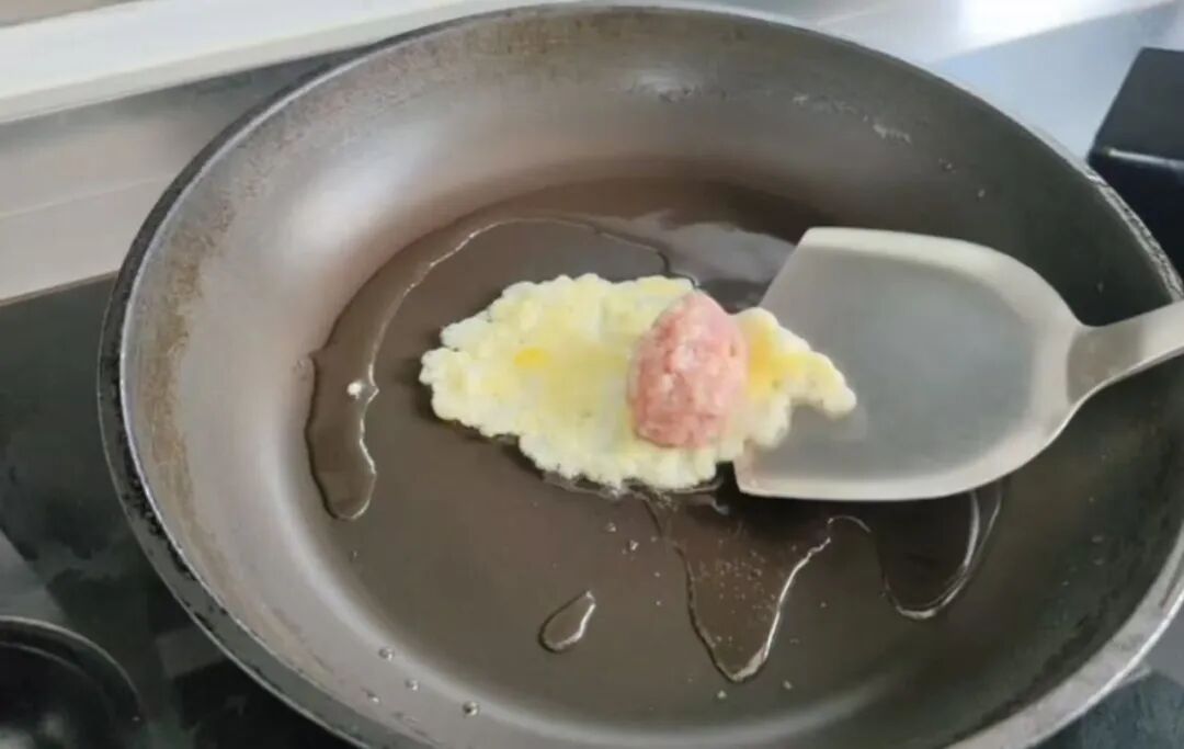 2. 当蛋皮边缘微微翘起、中间还有点湿润的时候,将1小团肉馅(大约是蛋皮的1/3量)放在蛋皮内侧。用工具掀起外侧的蛋皮对折盖在肉馅上,轻轻按压边缘使其粘合,煎3 - 5秒,等蛋饺定型后就可以取出了。