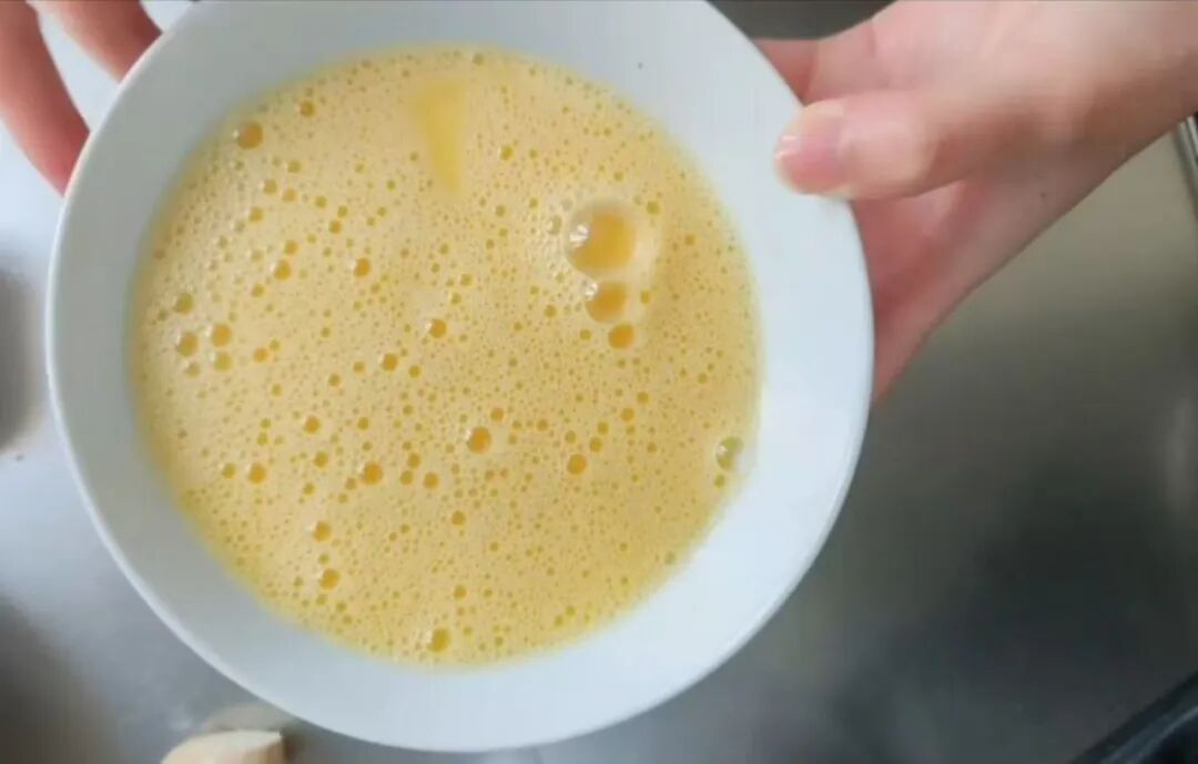把鸡蛋打入一个大碗中,用打蛋器或者筷子将蛋液充分打散,要确保蛋清和蛋黄完全融合,直到表面出现细密泡沫。
