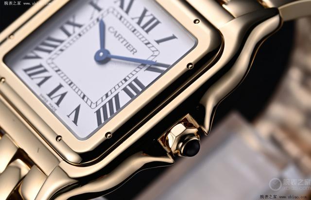 再看看细节,表冠上镶嵌着一颗蓝色宝石,这也是卡地亚一贯的设计风格。表侧的线条十分流畅,就像猎豹奔跑时的流线感。