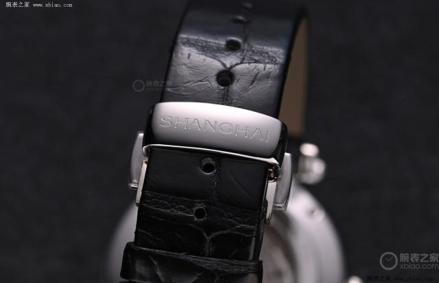 表带搭配的是一条黑色的鳄鱼皮表带,能大大提高佩戴舒适度,并且与表盘的适配性更高。表扣处刻有上海表的英文标识“ SHANGHAI ”。