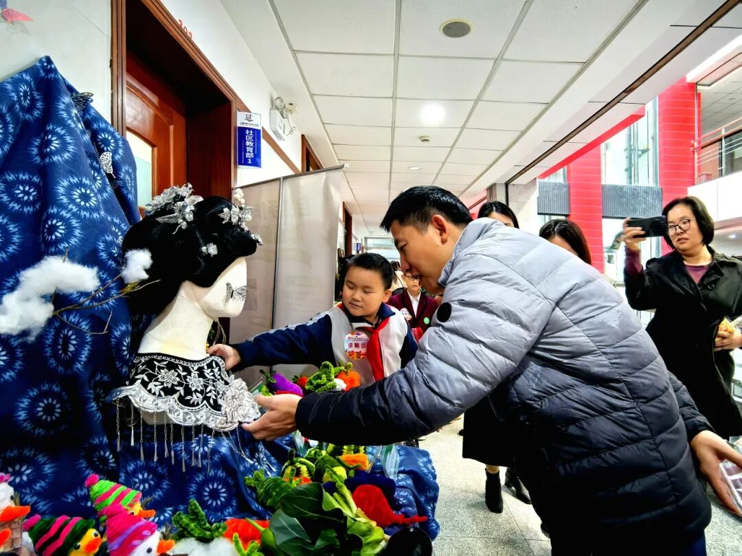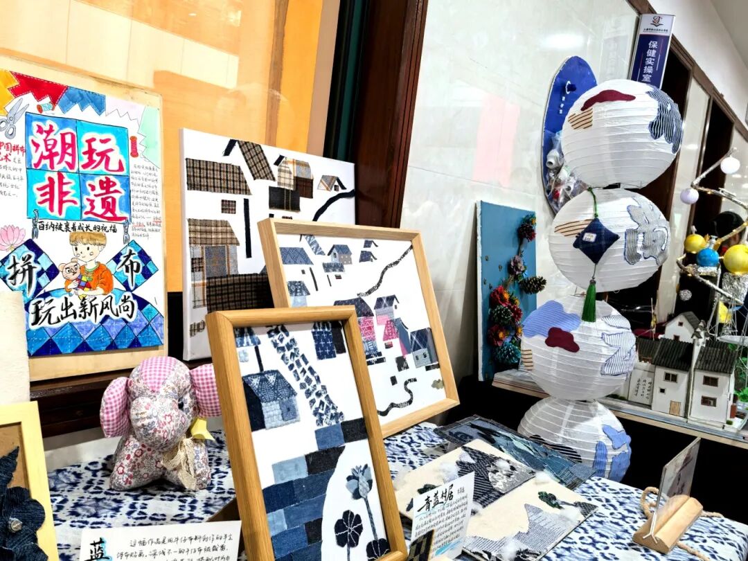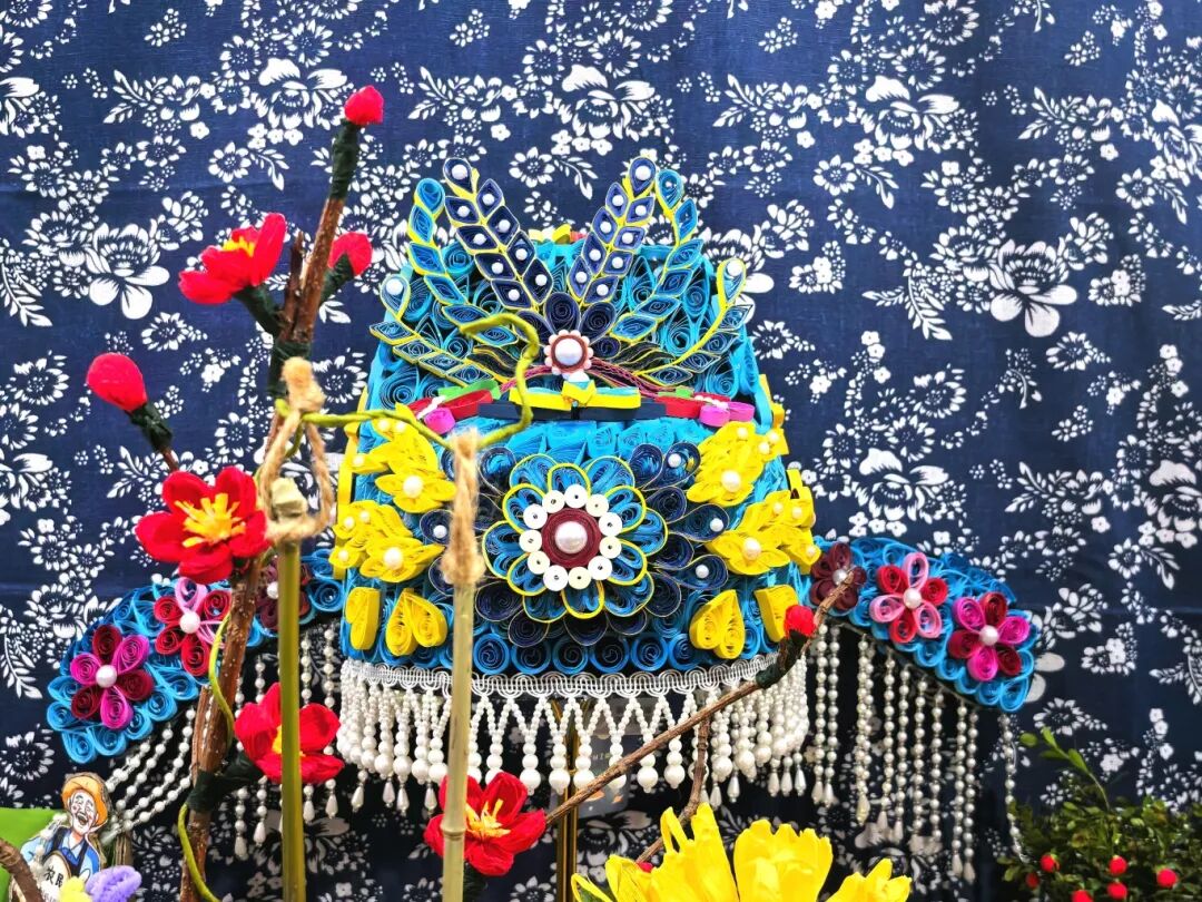记者在现场看到,主题作品展示区品类丰富,涵盖布艺、编织、陶瓷、针刺等,其中不乏传统工艺与现代科技相融合的创意作品。各参展学校还安排了学生解说员介绍作品的制作过程及巧思。在泗泾小学展位上,一顶做工精细的衍纸凤冠受到了围观,凤冠以蓝色为主色调,辅以黄色和红色,除了主材衍纸外,还选取白色圆珠为配件。这件作品是四年级学生张艺晴耗费两周时间制成。“主要利用放学后的空余时间来做的,所有的衍纸部件都是纯手工制作的,粘贴过程中因为要用到热熔胶,妈妈做了一些协助工作。”张艺晴说。