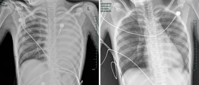 据介绍,笑笑一开始只是轻微咳嗽,发热到38℃,检查提示肺炎、肺不张。转诊到浙大四院儿科时,病情急剧恶化,出现呼吸急促、胸闷胸痛,体温38.5℃,只能靠5L/min的面罩吸氧维持血氧,胸片显示左肺已完全呈“白肺”改变,肺部炎症进展迅猛。