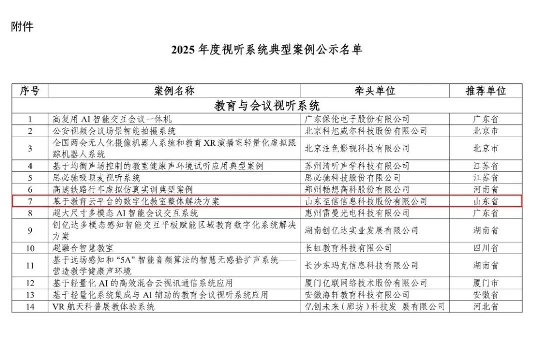 近期,工业和信息化部、文化和旅游部、国家广播电视总局等五部委组织开展的2025年度视听系统典型案例征集拟入选名单已公示。全省仅有4个案例入选,其中,山东至信信息科技股份有限公司的“基于教育云平台的数字化教室整体解决方案”成功入选教育与会议视听系统方向典型案例,并且是山东省该类别中唯一入选的案例。