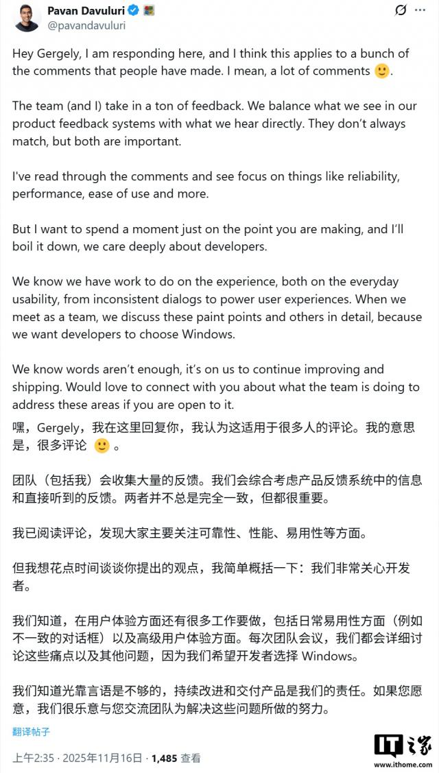 这一观点引发了微软高层的直接回应。Pavan Davuluri亲自回复,承认团队收到了大量关于可靠性、性能和易用性的反馈,并郑重承诺“我们深切关心开发者”。他表示,团队知道“光说不够”,会继续改进产品,但并未暗示会改变AI战略。