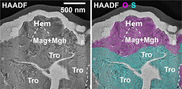 左图是使用透射电子显微镜(TEM)拍摄的赤铁矿晶粒的高角度环形暗场像(HAADF),右图是使用两种特征元素区分的铁氧化物(氧元素,品红色)颗粒和陨硫铁(硫元素,青色)颗粒的接触关系