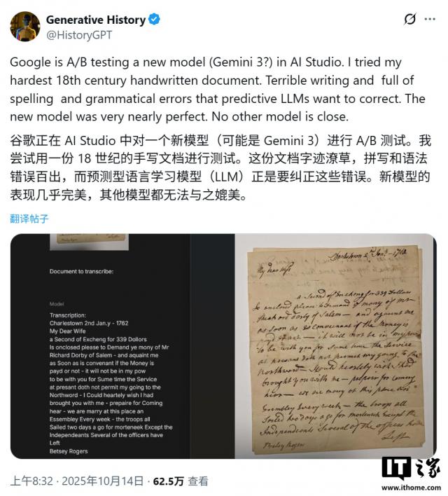 IT之家11月16日消息,科技媒体golem于11月15日发布博文,报道称谷歌通过其AI Studio平台,正在测试一款尚未命名的AI模型,该模型在破译难以辨认的历史手稿方面已接近人类专家的水平。
