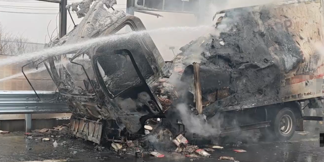 下面两起典型的案例值得所有人警醒。2025年2月25日,江苏泰州消防接到报警称,京沪高速上一白色厢式冷链货车突发火灾。消防接警后立即赶赴,消防员到场时,车辆停靠在应急车道上,现场浓烟滚滚,火势正处于猛烈燃烧阶段,并不时传出噼啪的爆裂声。由于车厢内装载的冻品包装材料多为易燃物,火势蔓延迅速。经过消防员和现场交警的紧急处置,明火终被扑灭。据司机介绍,这是一辆冷链运输车,车上装载的为冷冻肉制品,烧毁的货物价值达10万元左右。