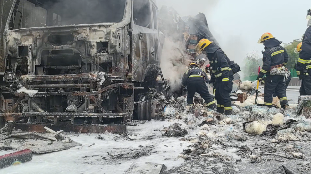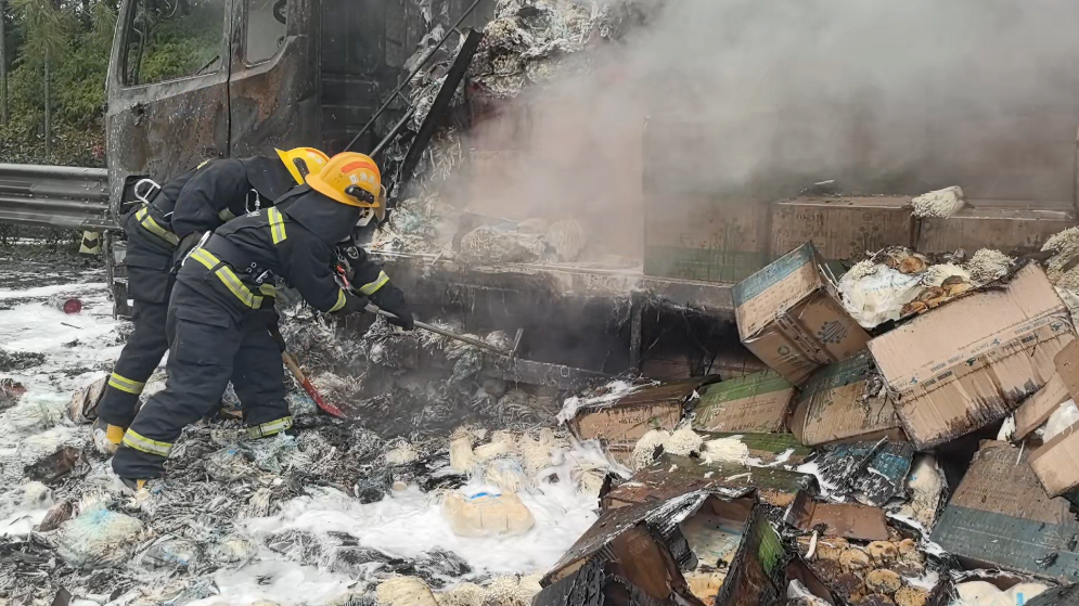 抵达现场后,根据现场情况,消防员先用水枪压制明火,待火势得到控制,又对车厢内部持续降温,同时用铁锹拨开装载的金针菇,仔细排查阴燃隐患。经过约一小时的紧张作业,大火被完全扑灭,但车上10吨金针菇被全部烧毁。