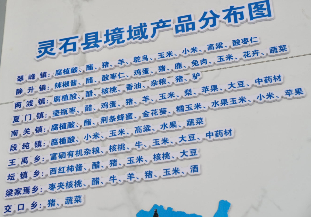 灵石县乡村e镇公共服务中心展示的各乡镇农特产品名单。 澎湃新闻记者 王珏玮 翻拍
