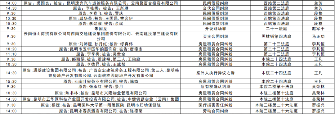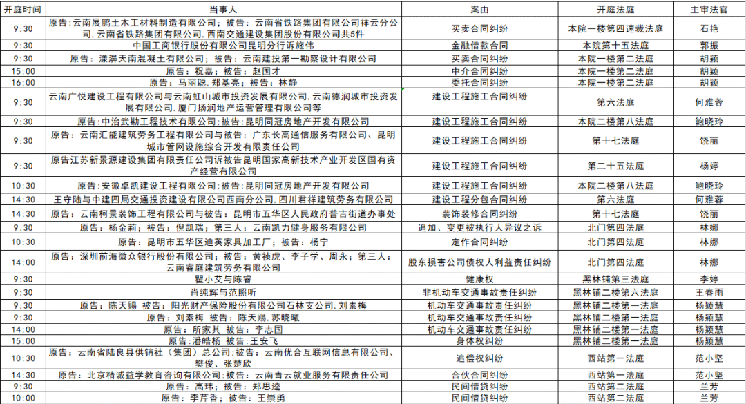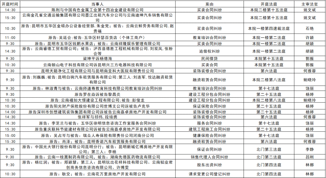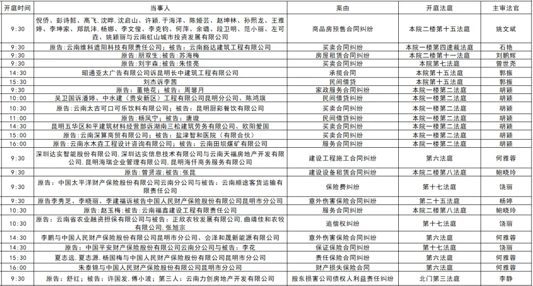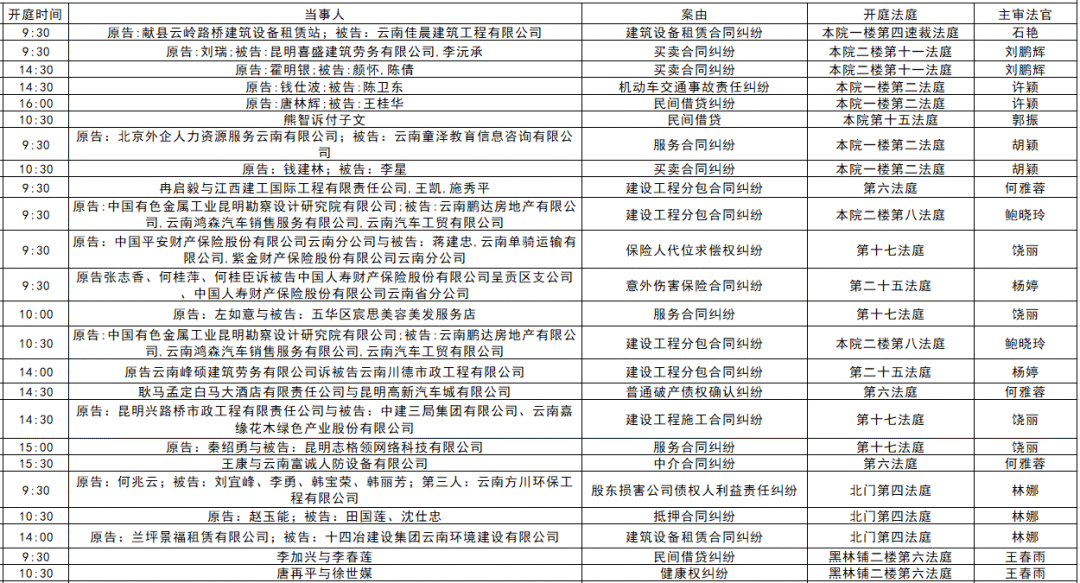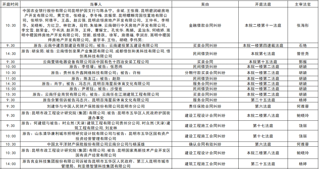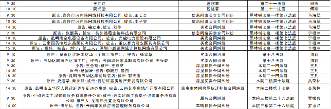 以下是五华区人民法院2025年11月17日至11月21日的每周开庭安排。
