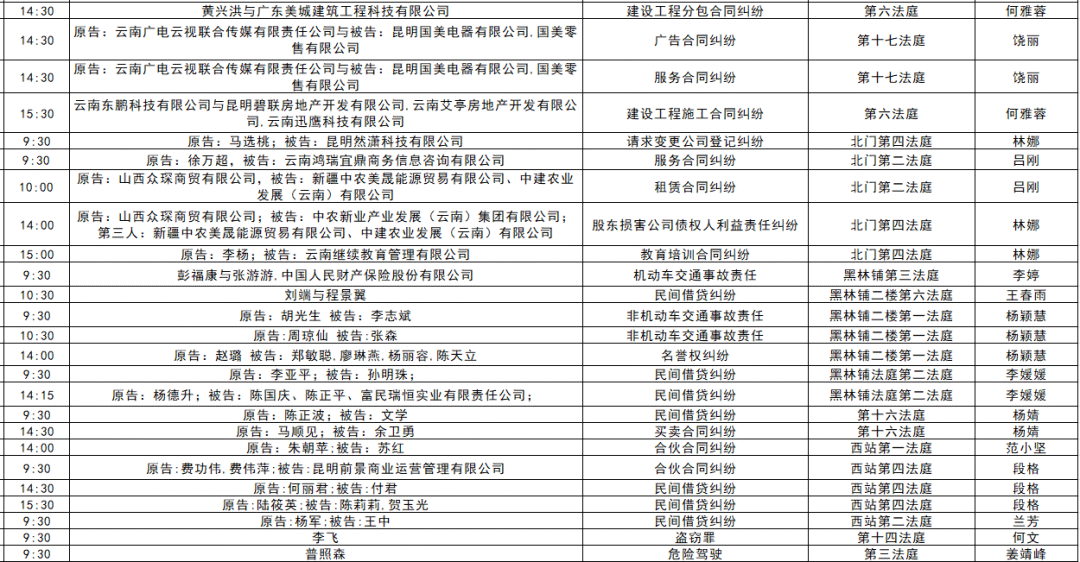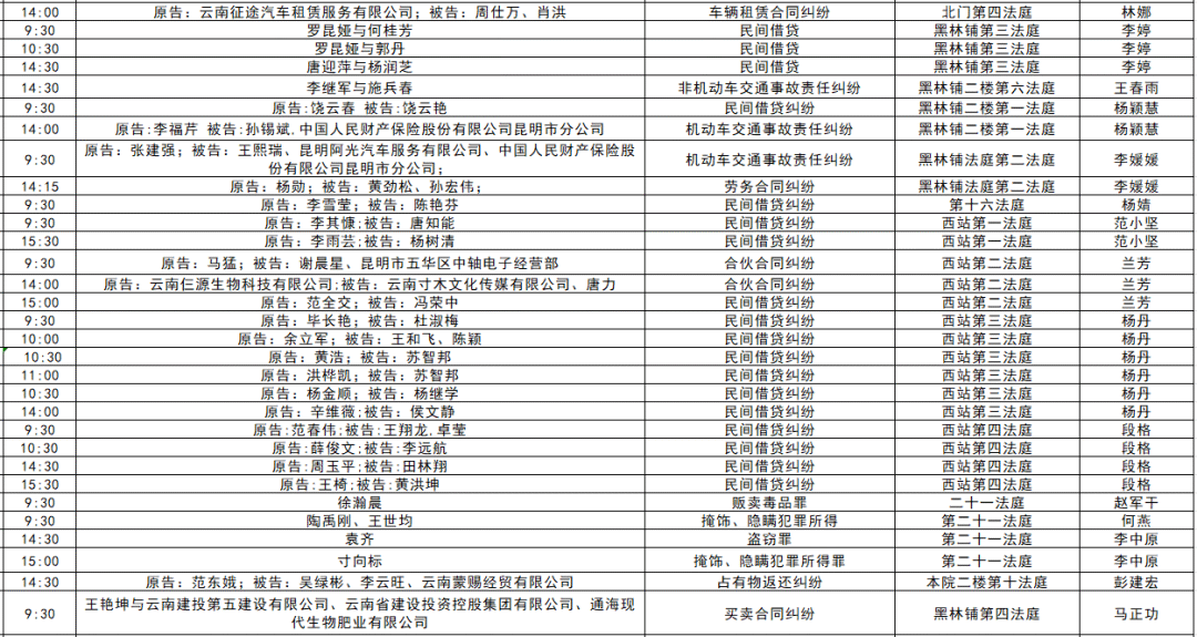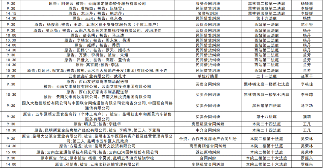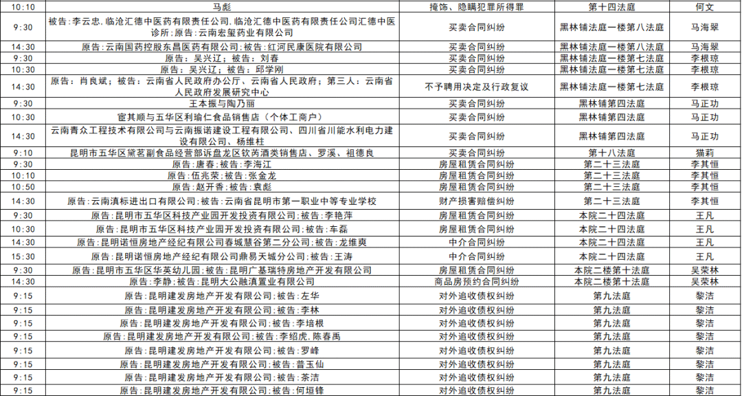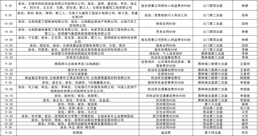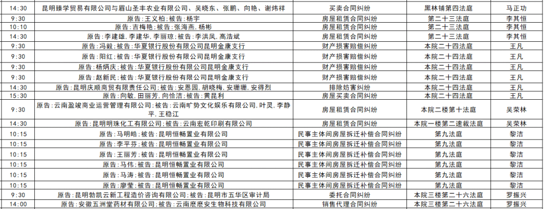 以下是五华区人民法院2025年11月17日至11月21日的每周开庭安排。