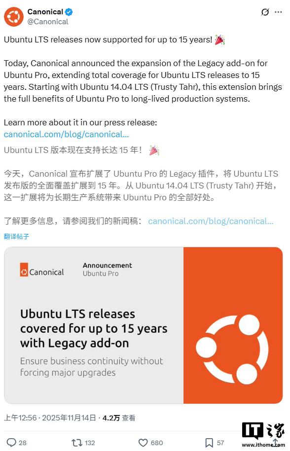 IT之家11月16日消息,Ubuntu发行商Canonical于当地时间周四发布公告,宣布借助Ubuntu Pro的Legacy附加组件,把Ubuntu LTS版本的支持周期延长到15年。