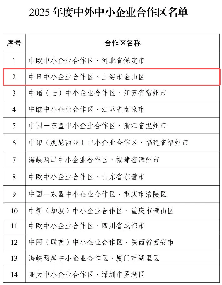 近日,2025年度中外中小企业合作区名单公布,金山区被确定为中日中小企业合作区。