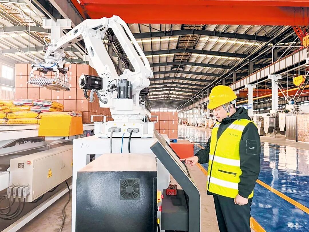 博阳机械生产车间内,智能机器人装车线正在作业。