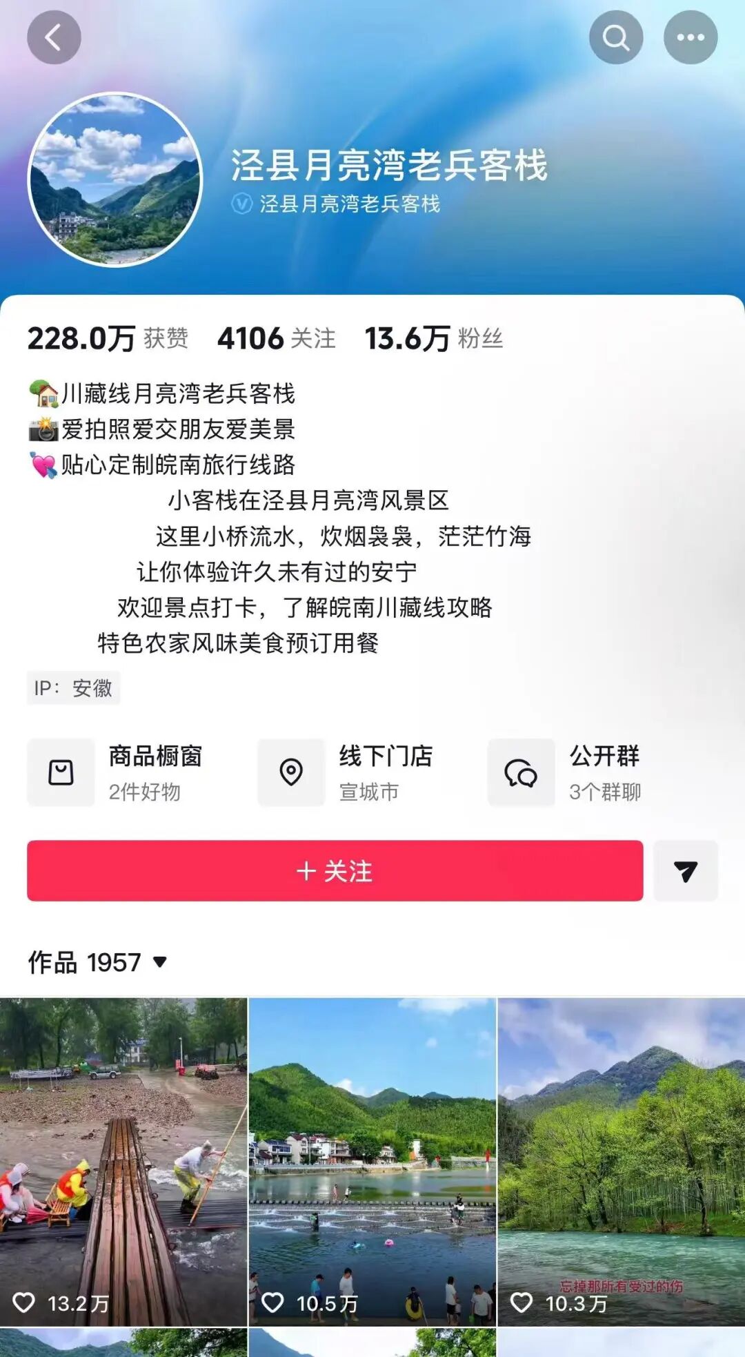 “坚持就有回报”,渐渐地他的抖音账号积累了13万粉丝,浏览量超3亿,点赞量228万。他经营的老兵客栈也因此登顶“安徽民宿热门榜”,民宿年营业额达200万元。