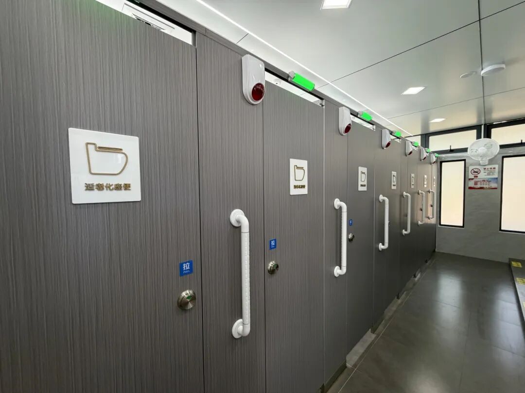 “城心驿”的设计充分考虑了特殊人群的需求,马桶间有求助按钮和扶手,老人万一发生特殊情况可以求助,每个坐便器边都设有台阶,符合适老化设计。