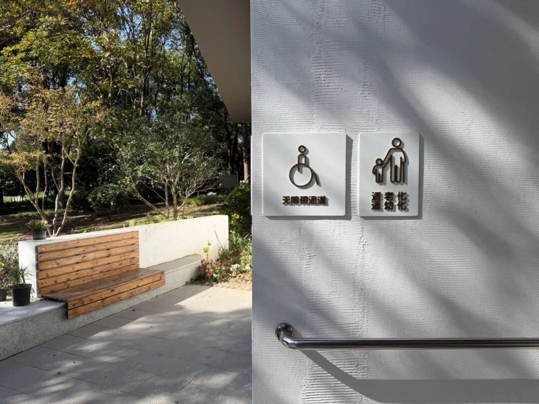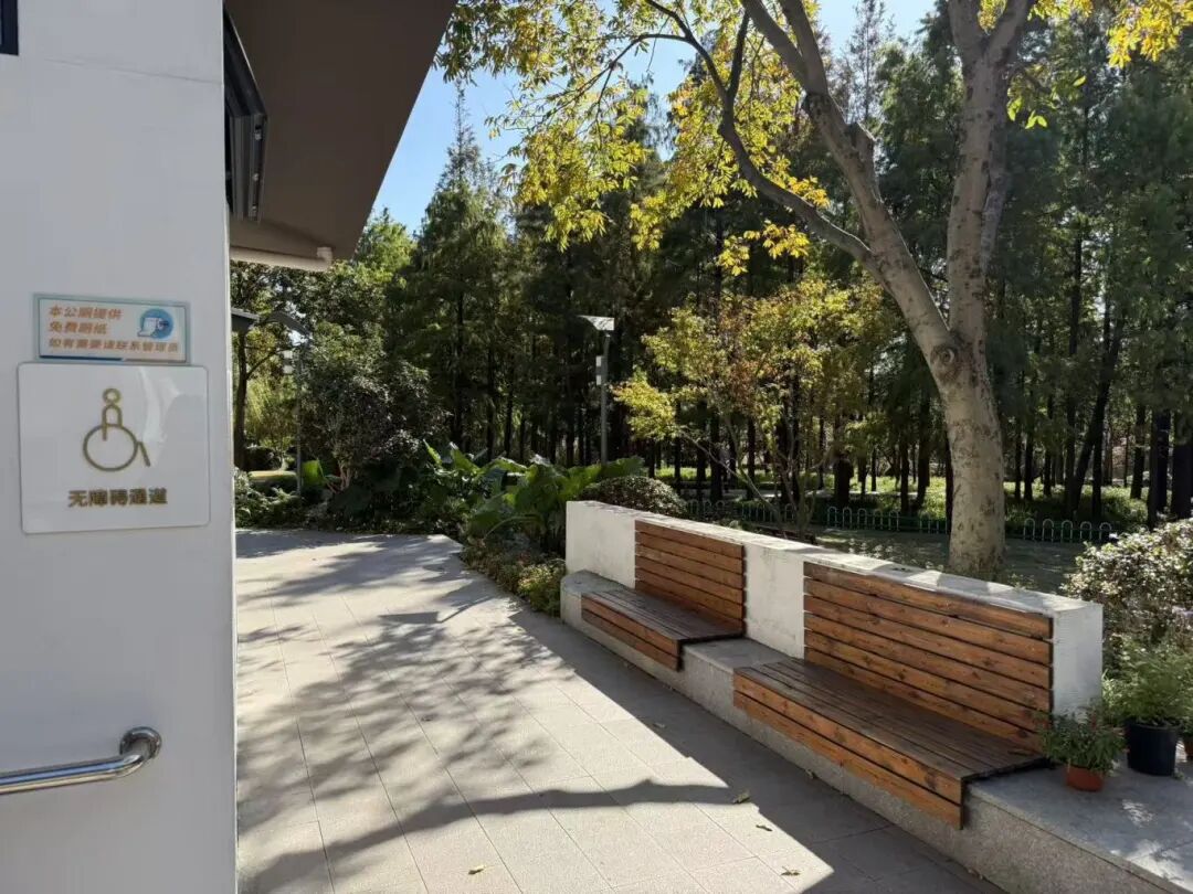 公厕休憩区的大理石基座与原木贴面组合式座椅,搭配室外公共遮阳设施,让往来行人在漫步、观景中获得短暂休息。