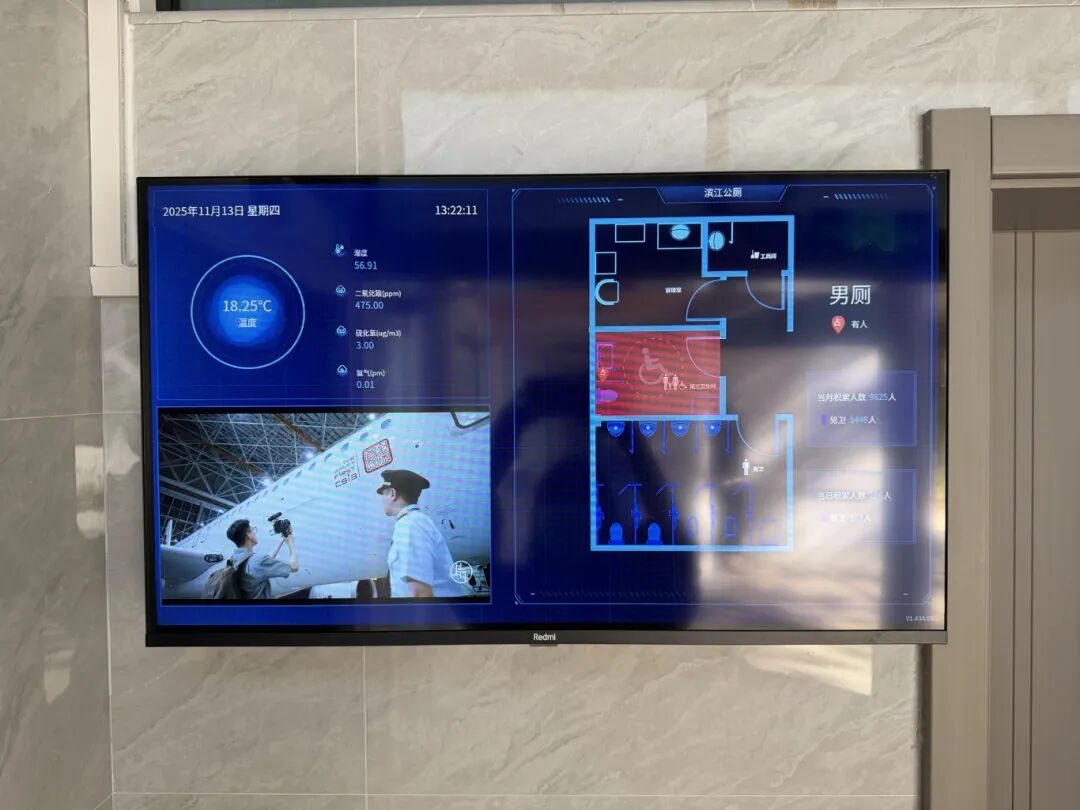 公厕内部,智慧化管理系统令人耳目一新。男女卫生间分别增设智能交互大屏,依托数字孪生技术,实时显示周边气象数据、环境参数及厕位使用状态。