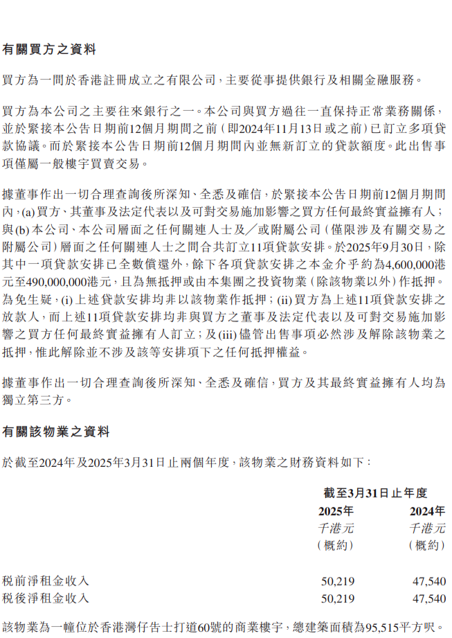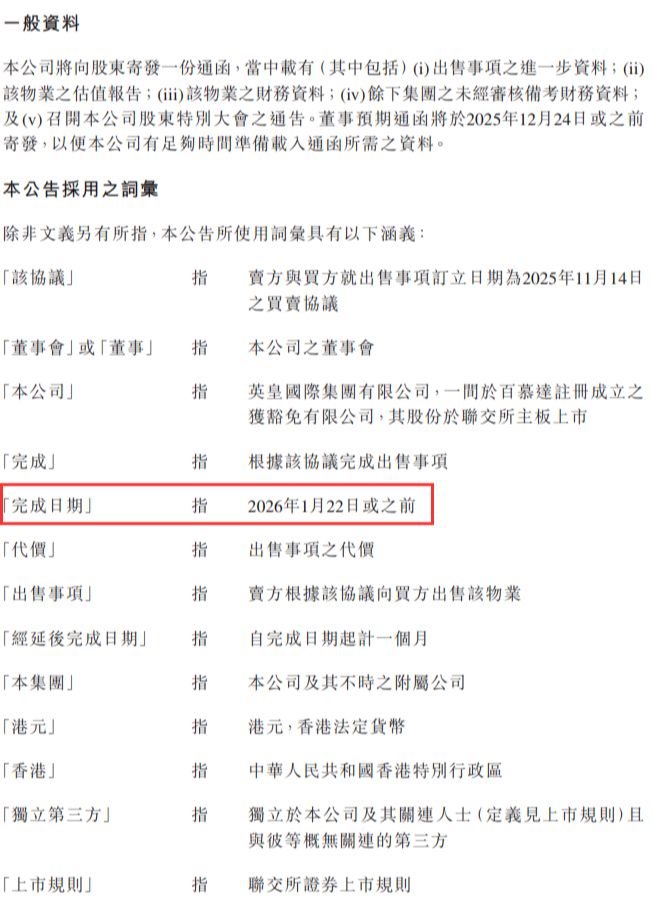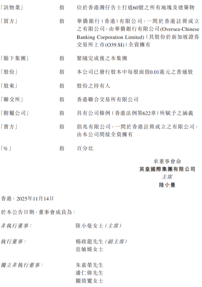 2025年11月14日,港股上市公司英皇国际 (00163.HK)发布《关于非常重大出售事项的公告》。公告显示,英皇国际将旗下位于香港湾仔的一栋写字楼,以11.6亿港元(约人民币105,954.4万元)的价格出售给华侨银行(香港)。华侨银行是英皇国际的主要往来银行之一,此前英皇国际曾向其贷款。