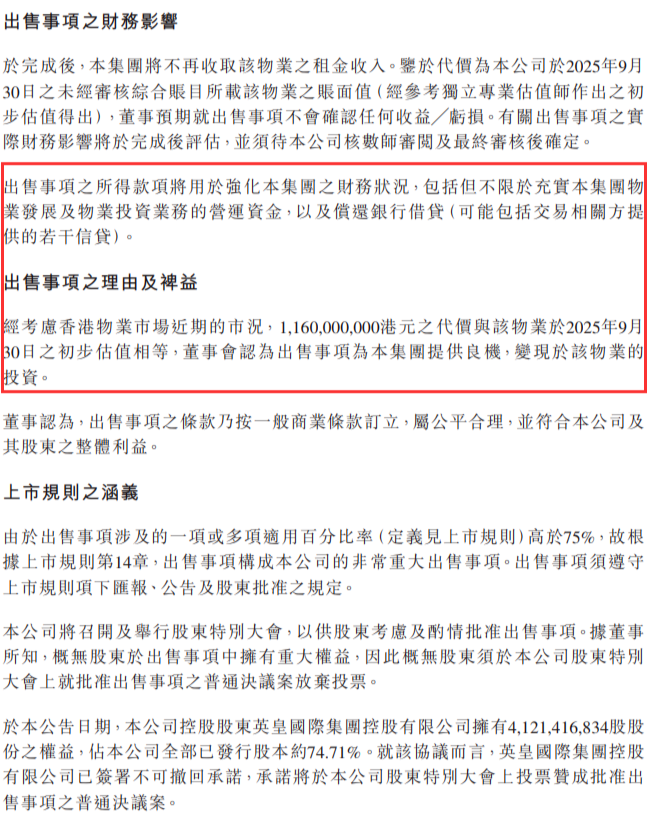 英皇国际认为,在当前香港房地产市场环境下,这是一个将该楼投资价值变现的好时机。出售楼宇所得款项,将用于改善公司财务状况,如补充物业发展和投资的运营资金,以及偿还银行贷款。