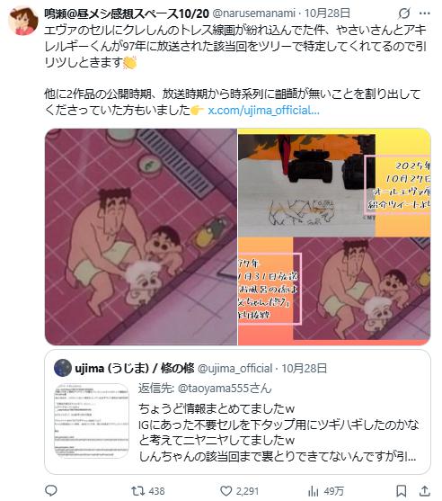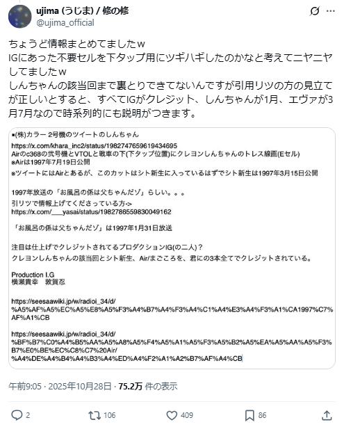 有眼尖的粉丝解释,这可能和制作人员背景有关:“那应该是1997年播出的《洗澡值日生是爸爸哦》那集的制作稿(作画监督为樋口善法),他也曾在Production I.G工作,所以出现在线稿堆里很正常。”