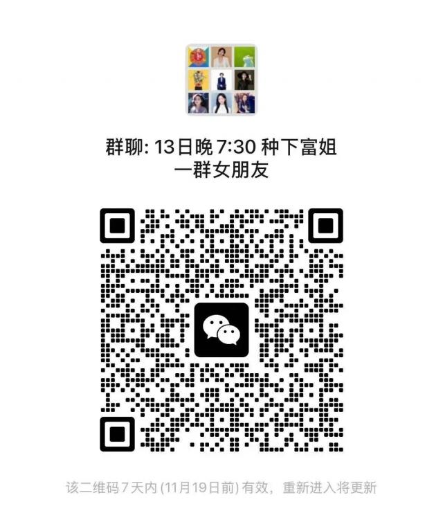 如果你想了解一群女朋友联盟这个高净值女性企业家组织,以及自己和它如何关联,它如何帮助大家做私域联合、流量搭建销售体系等。11月13日明天晚上7:30,我在社群等大家,因需充分沟通,限定名额,请抓紧报名。请扫码入临时群,并群内接龙,发一元红包到群内。让我们以信任为土,以互助为光,共同长成一片茂盛的财富森林!