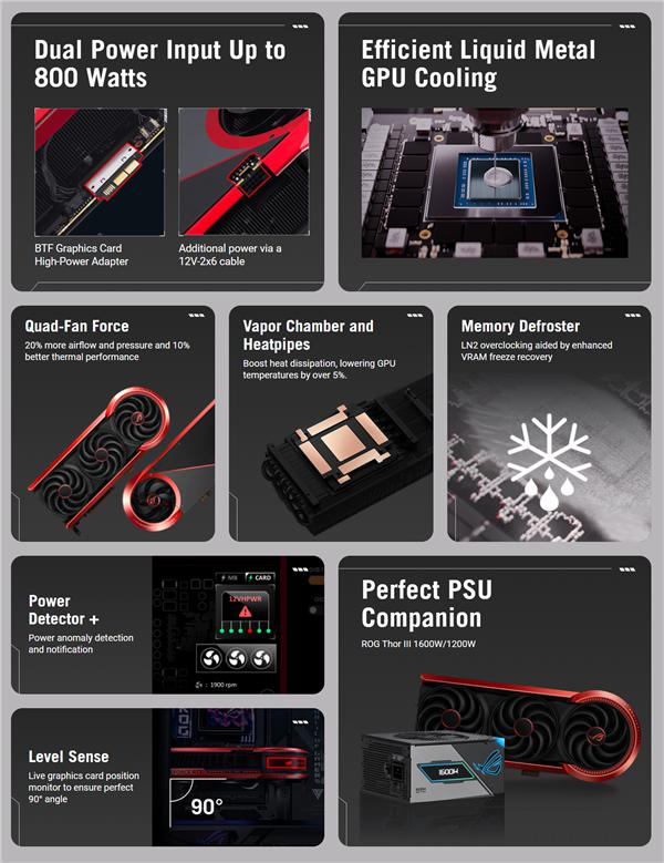 其频率出厂预超至2580MHz,OC模式下为2610MHz,最高可达2730MHz,比公版高出足足323MHz,最大功耗800W。