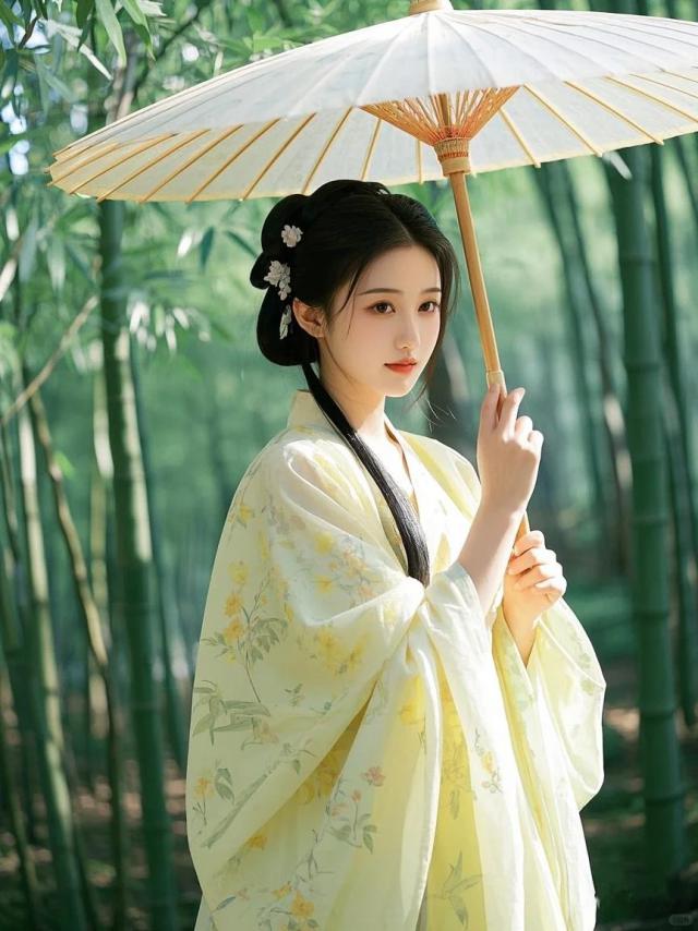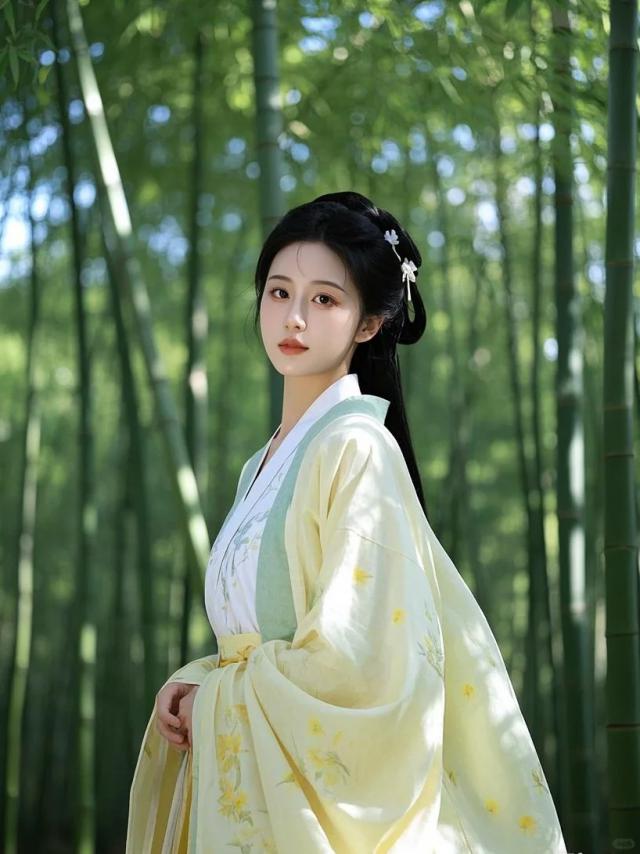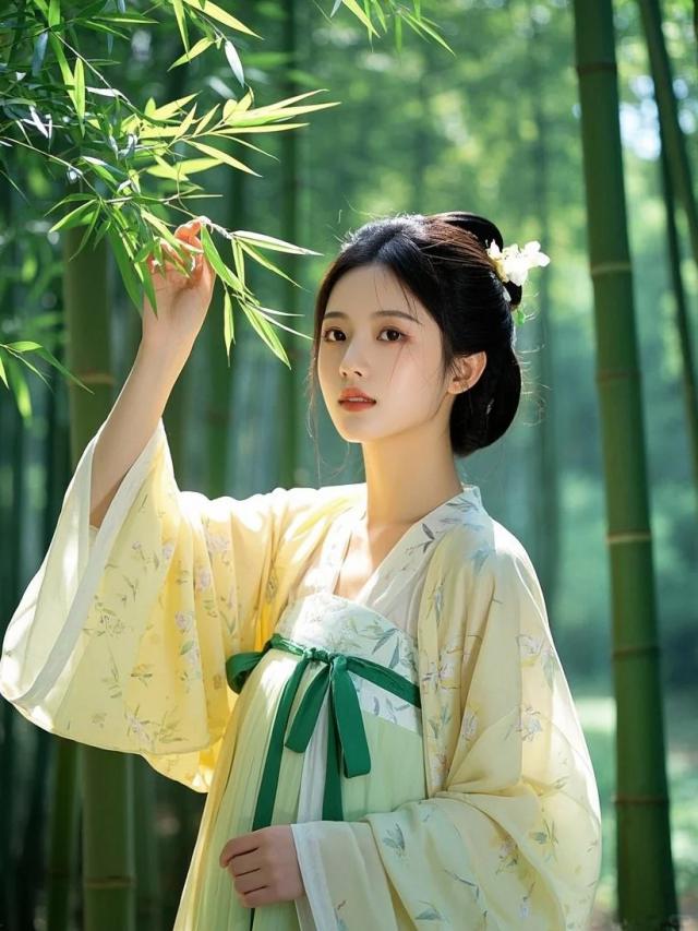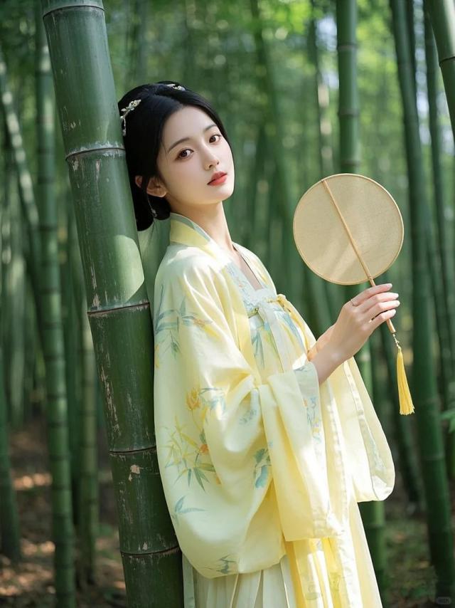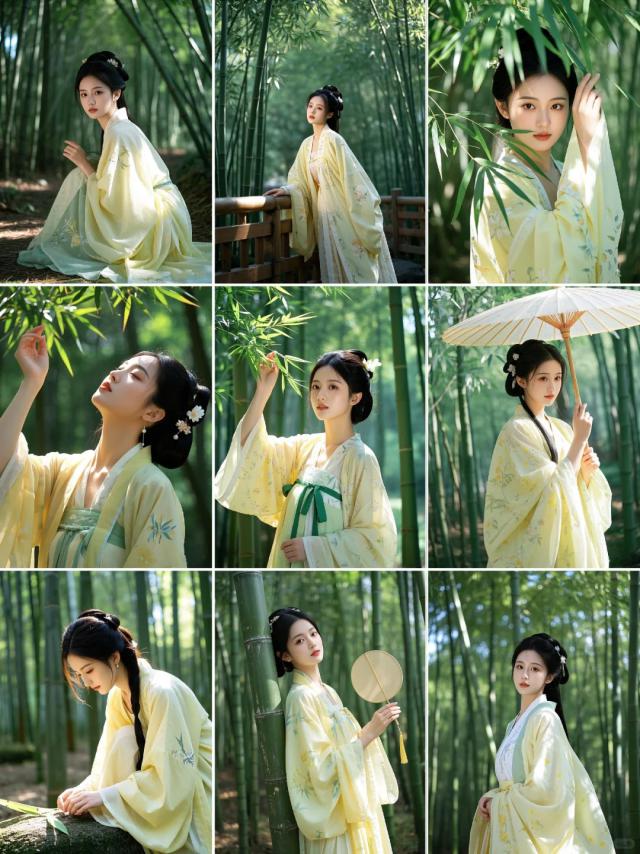 - 侧身倚靠竹干,手持团扇轻掩面颊或自然垂落,眼神柔和望向镜头或远方,突出汉服的飘逸感。