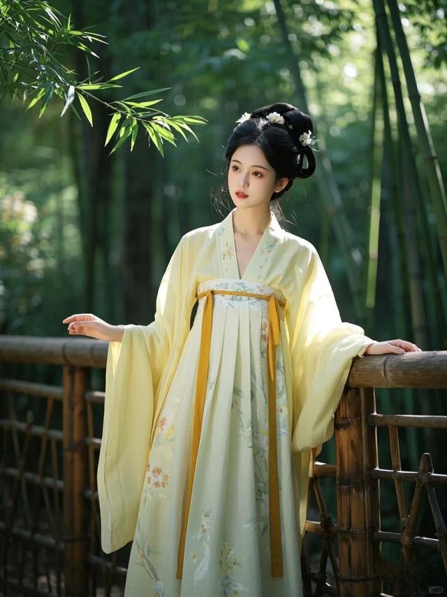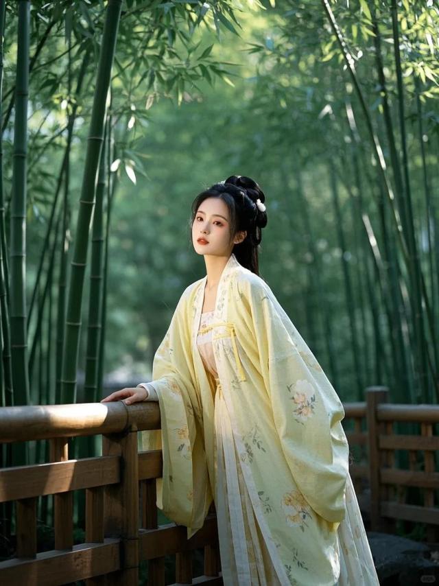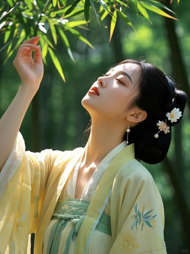 - 若有竹桥或竹篱,可单手轻扶栏杆,另一手轻提裙摆,身体微侧,目光望向竹林间隙的光影。