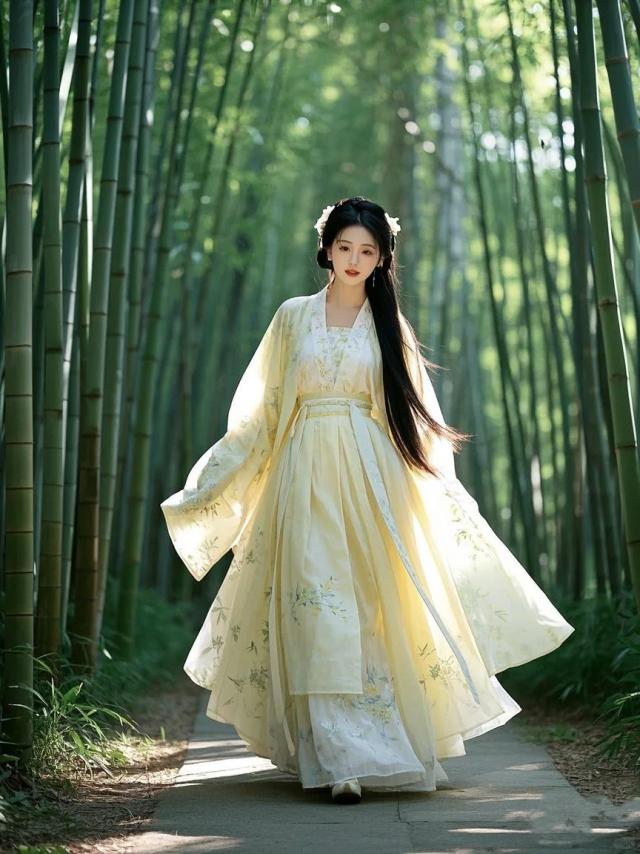 - 沿竹林小径缓步行走,双手轻提裙摆或自然垂落,回眸浅笑,营造故事感。