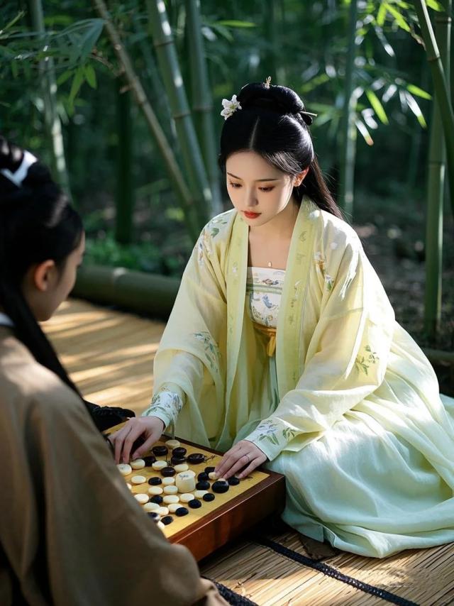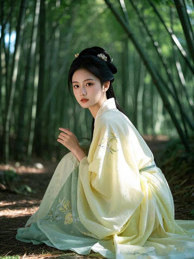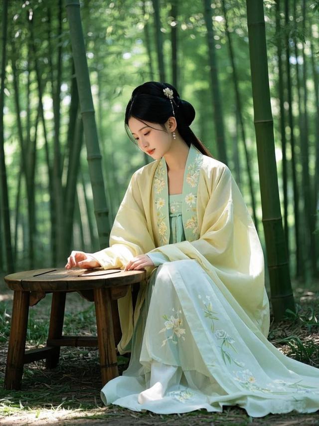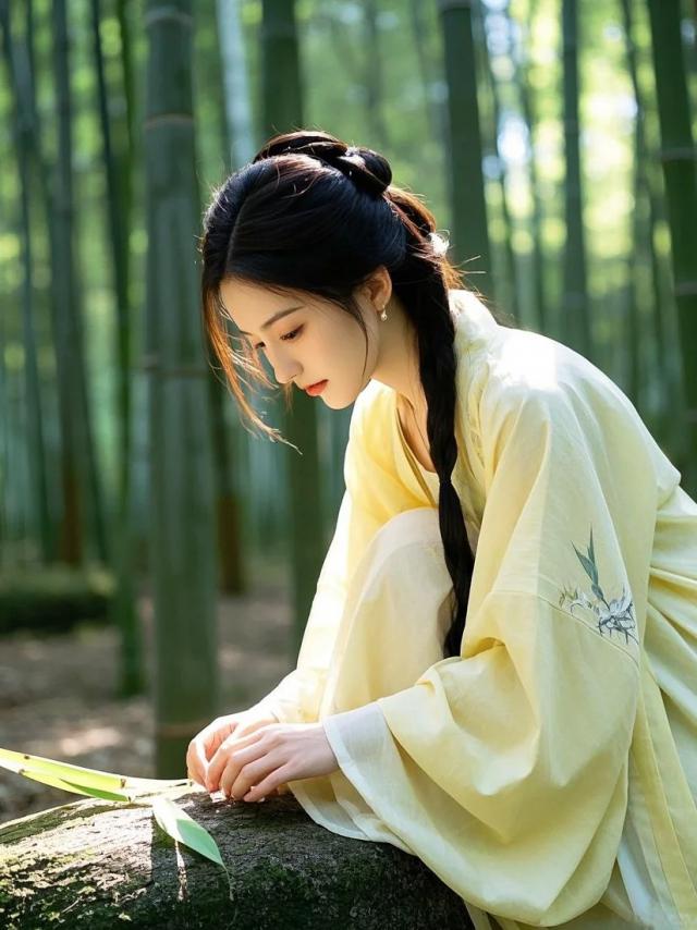 - 席地而坐或坐在竹制矮凳上,裙摆自然铺开,双手轻搭膝上或托腮沉思,眼神低垂或眺望竹林深处。