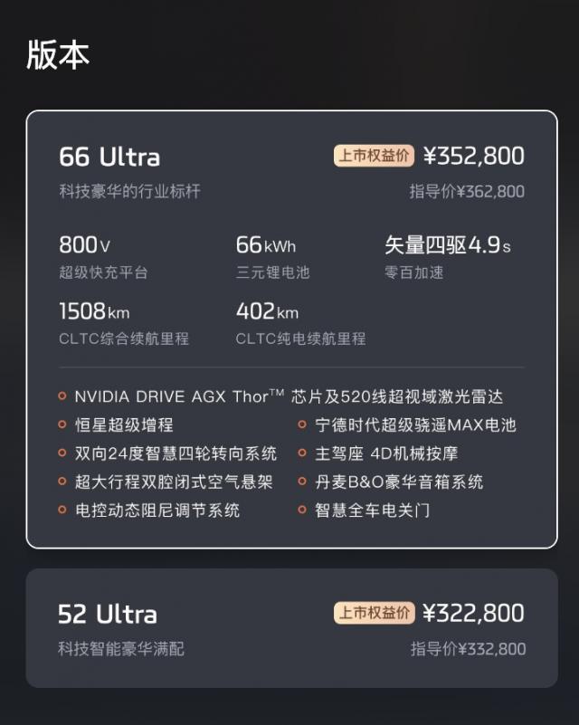 再如,全系标配 800V 架构,支持超快充,10 分钟可补充 150km 续航,还支持使用 92 号汽油,百公里最低综合油耗低至 2.81 L。其搭载的恒星超级增程系统,续航表现出色。52 Ultra 车型搭载 52 度宁德时代电池,CLTC 纯电续航为 320km,满油满电综合续航为 1454km;66 Ultra 纯电状态下 CLTC 续航为 402km,满油满电综合续航为 1508km。