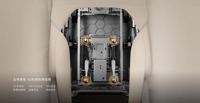 全车配备三把零重力座椅,副驾和两个二排座椅均支持 4D 机械按摩,可媲美家中按摩椅,在同价位车型中十分少见。