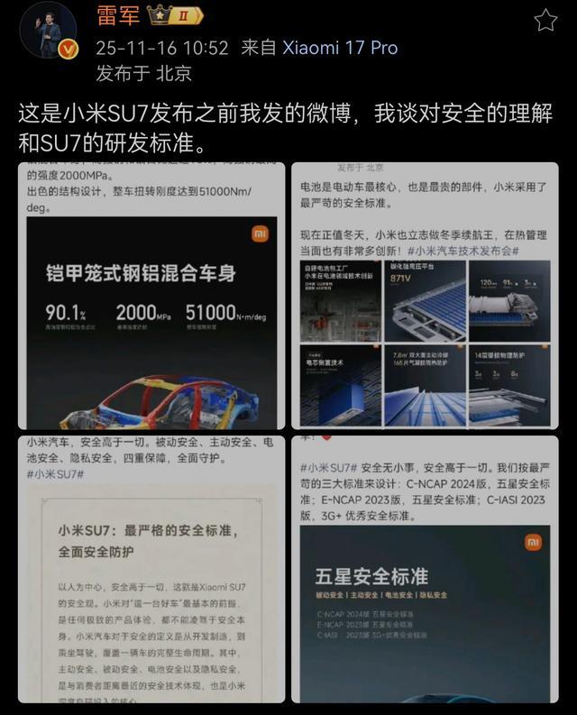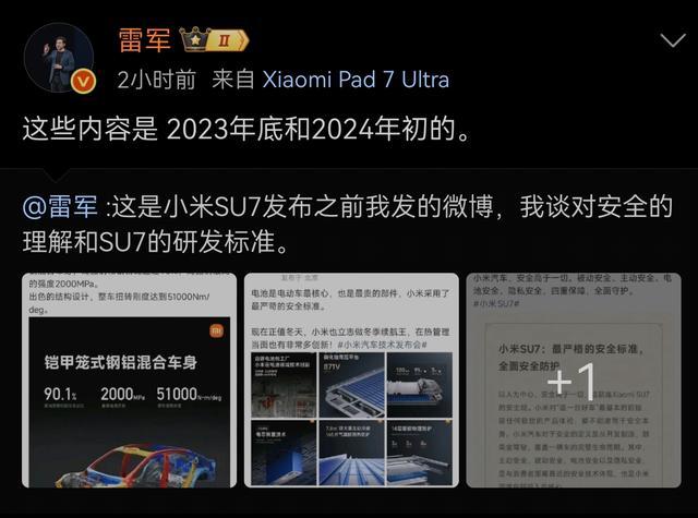 随后不久,雷军再发微博强调其早在小米SU7发布前就多次宣传小米汽车的安全性能。