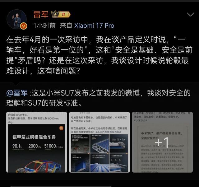 雷军连发微博回应:车好看首位与安全前提是否矛盾?