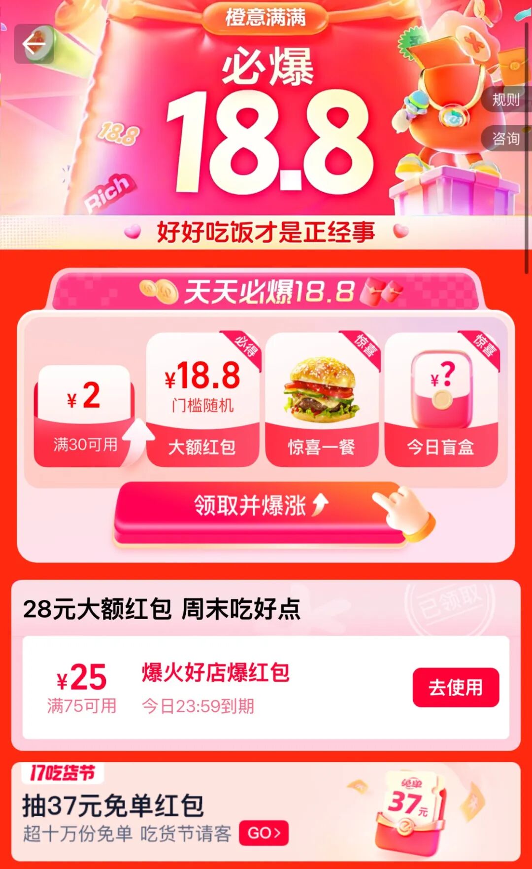 但这次美团发起“致敬”营销后,饿了么和网友都不愿“接招”。用户对美团“致敬信”的讨论,远不如上次“黄的灵,蓝的赢”热烈。不过,美团和饿了么面向用户的补贴都没少。美团送1000万份“花兑换券”,饿了么上线“天天必爆18.8元”“大额红包”“超级吃货卡一张爆多张”玩法,活动周期为11月14日 - 11月30日。