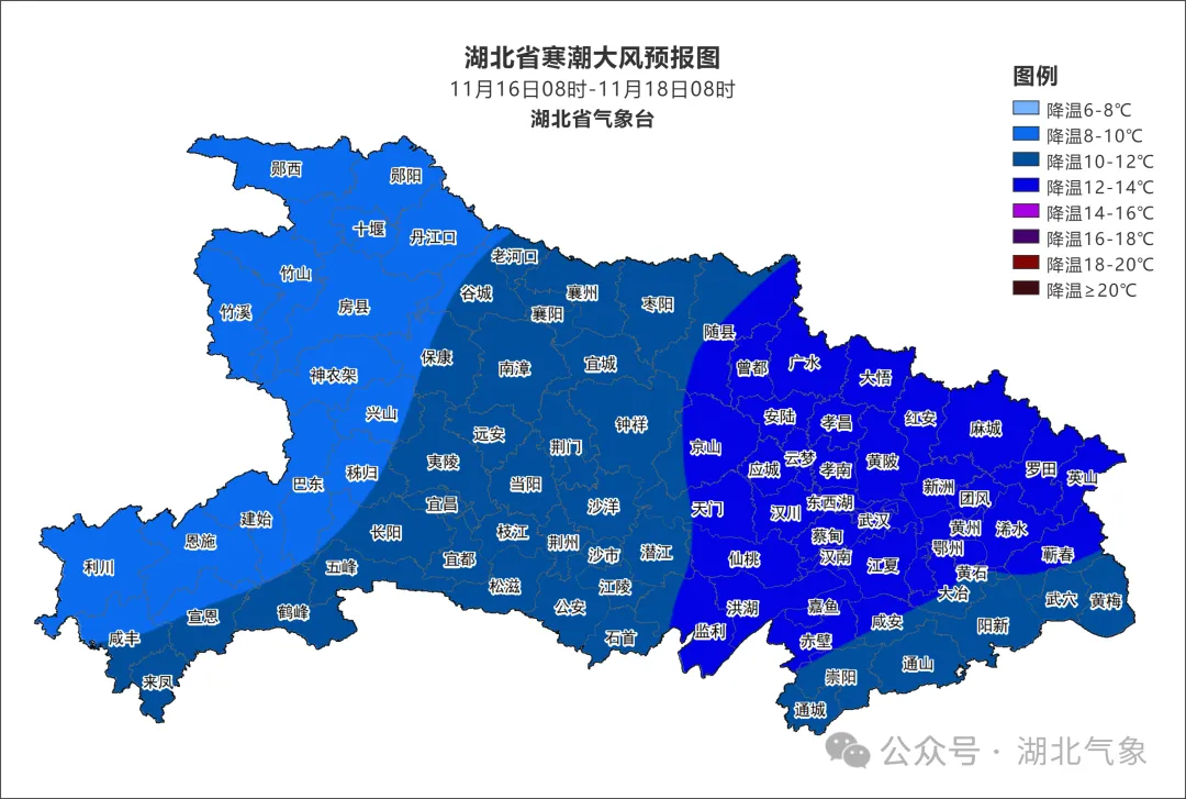 据气象预报,17日我省将迎来寒潮大风天气,平均气温会下降8~14℃,偏北阵风达7~9级,鄂西山区会出现雨夹雪或雪(1200米以上高山区有中到大雪,积雪深度2~5厘米);18日至23日天气好转,气温逐步回升。