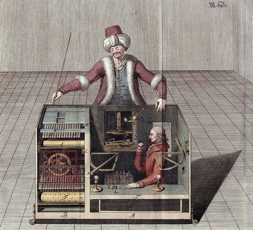 1770年,奥地利发明家肯佩伦制造了一个「会下棋的机器人」:木柜子上坐着一个穿土耳其服装的机械人偶,面前摆着棋盘。它棋艺高超,击败了无数棋手,连拿破仑和富兰克林都败在它手下。