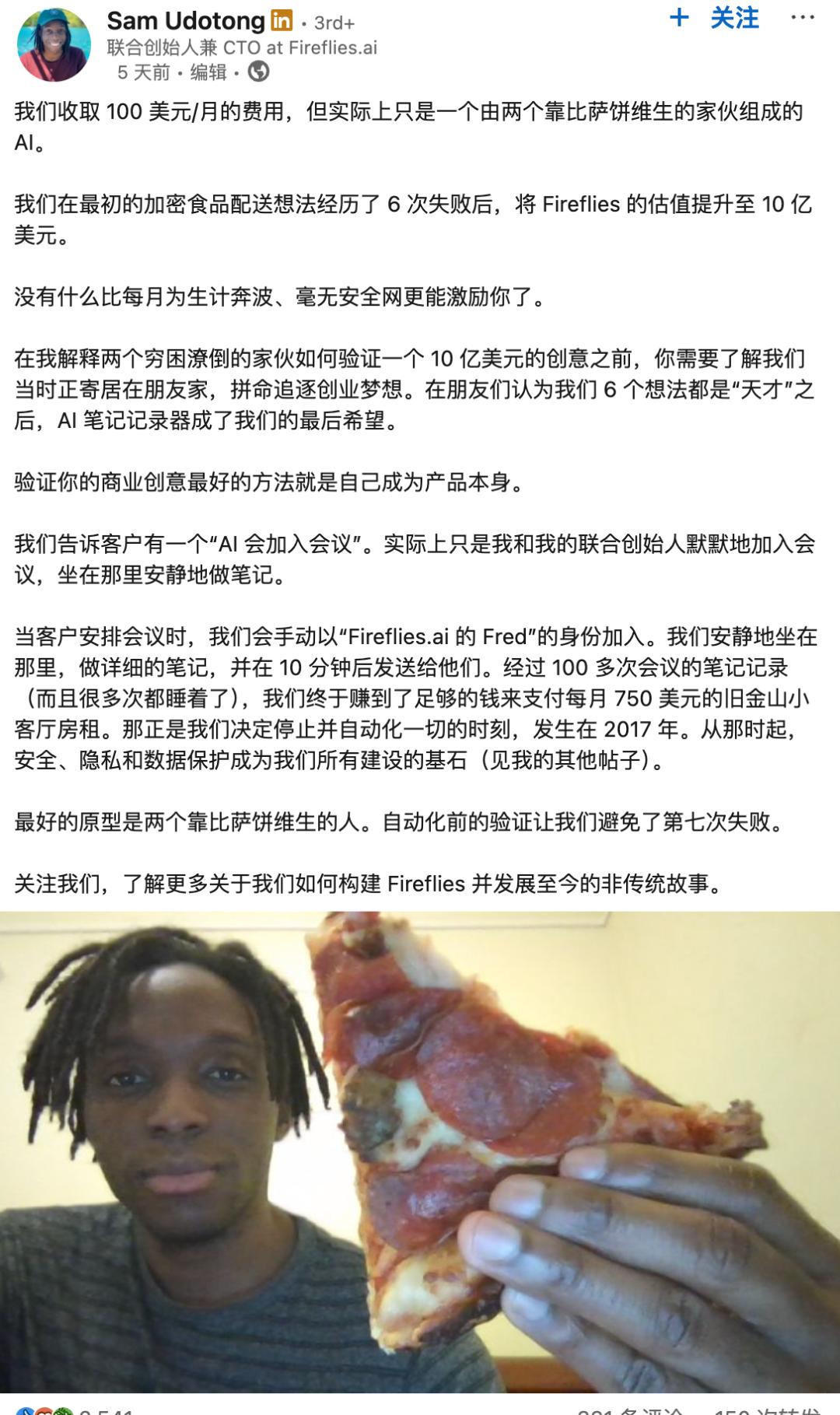 几天前,Fireflies.ai的联合创始人兼CTO Sam Udotong在LinkedIn上发了一条帖子,原本想分享一些创业心得,结果却不小心把公司早期的家底全抖了出来。
