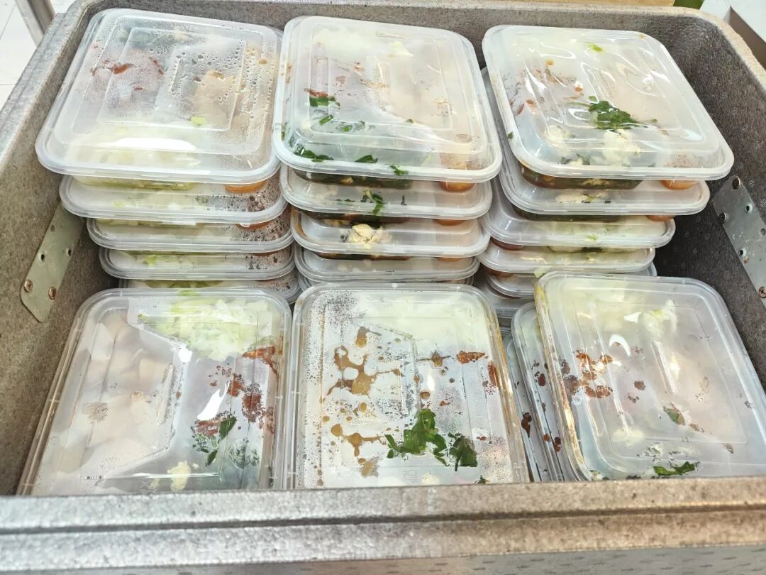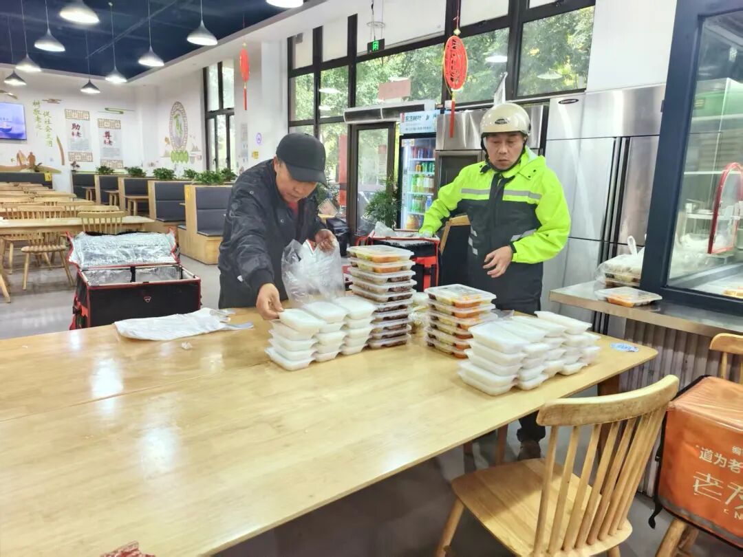 活动当天,骑手们小心翼翼地将装满盒饭的保温箱搬上运餐车,开始给老人送餐。一位骑手介绍,为确保送到老人手中的饭菜始终热气腾腾,他们提前根据地址,按照就近原则排布了送餐路线,既要保证每一餐准确无误地送到老人手中,又要确保送餐及时,让老人们尽快吃上热乎饭。
