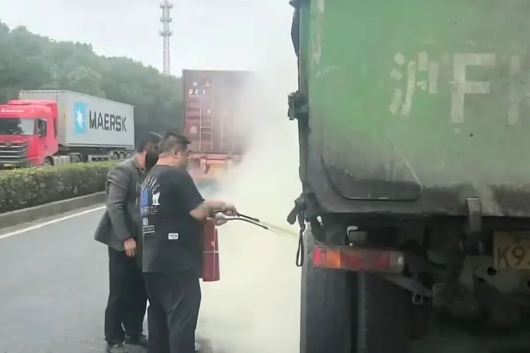 泉泾村工作人员张宇回忆道:“当时我们正在村委会,突然听到外面‘砰’的一声巨响,就像爆炸一样!”他和同事立刻冲出门外,发现一辆打着双闪的卡车停在不远处的路面上,左后轮胎因爆胎起火,白色浓烟不断涌出,卡车司机站在一旁不知所措,现场情况十分危急。