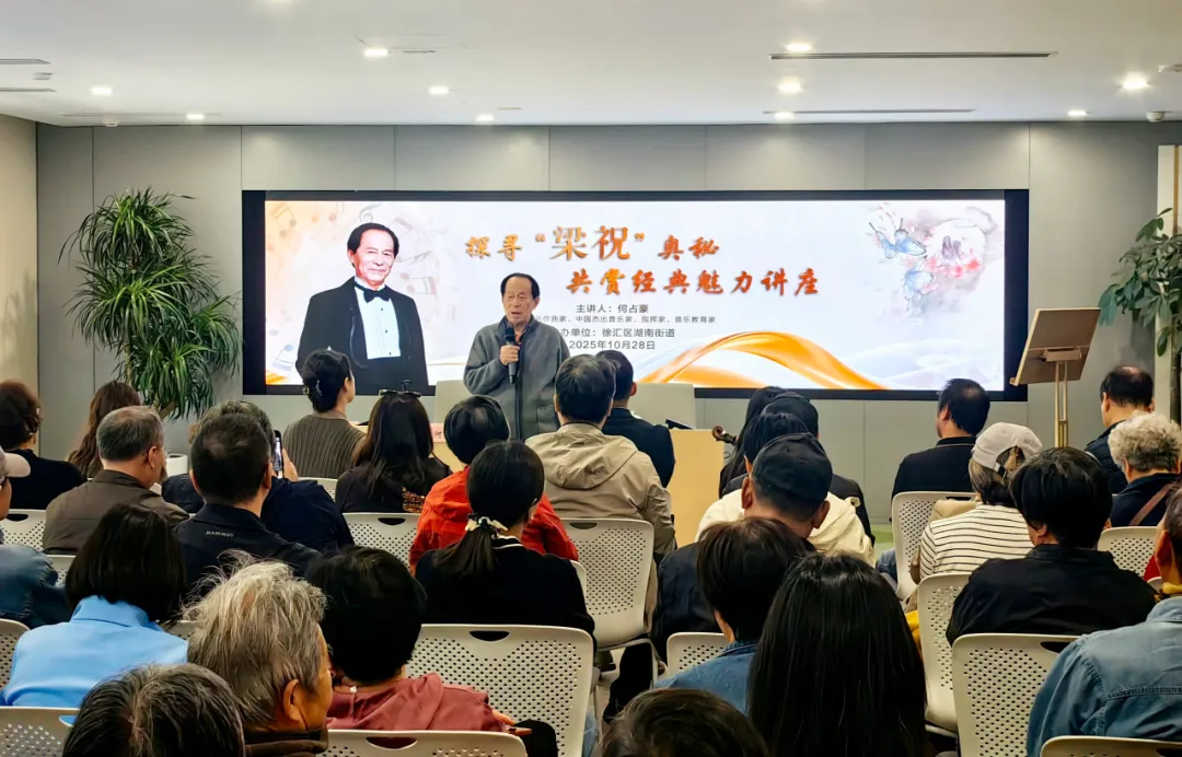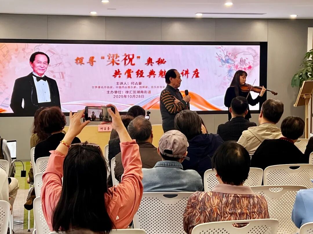 近日,在复兴西路8号的徐汇区湖南街道党群服务中心内,街道特意邀请了居住在辖区的文化知名人士——《梁祝》小提琴协奏曲主创之一、著名作曲家、音乐家、指挥家何占豪,举办了一场以“探寻‘梁祝’奥秘,共赏经典魅力”为主题的讲座,为大家揭开经典旋律背后的文化密码与创作初心。